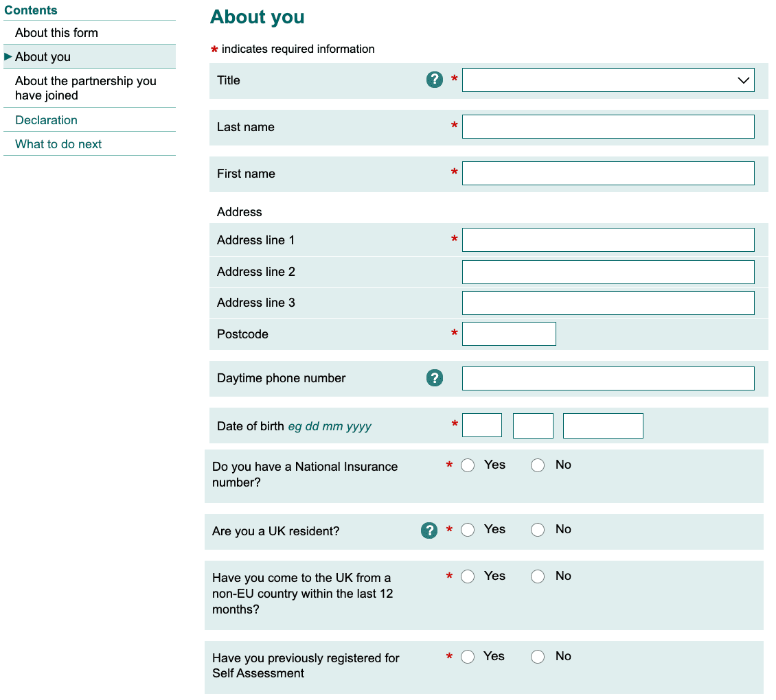 To register for Self Assessment because you've joined a partnership (in your case, it's the Limited Liability Partnership through which you bought your home), please complete the SA401 form linked above. The following steps in this guide will take you through each stage of the SA401.